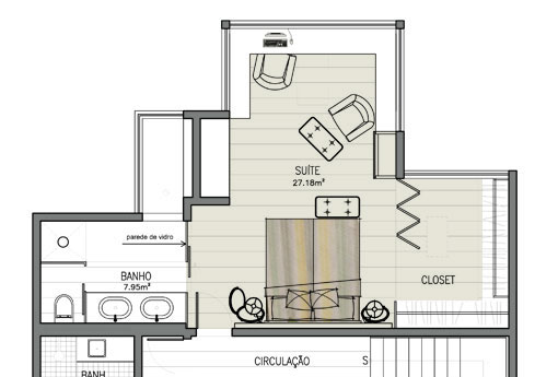 Na suíte master, o grande show do 2º pavimento, a principal ideia foi integrar todos os espaços num ambiente único: closet, dormitório, banheiro e escritório. Para isso bastou apenas eliminar duas paredes e modificar a posição da porta para conseguirmos um novo layout fluido e espaçoso.
